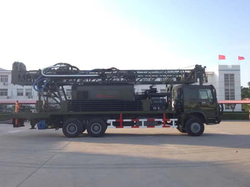 The CDC-200J is a truck- mounted water well drilling rig. It's main components are installed in the "Dongfeng" brand automotive chassis, added a separate diesel engine as power, can also be provided with the motor as power, which can be electrically firewood dual-purpose. Equipped with the appropriate device and drill tools, can realize mud circulation drilling, or DTH hammer drilling. The drilling rig uses a top drive mechanical power head with high torque for large diameter drilling. It can be used for the farmland irrigation, drinking water and industrial water supply.